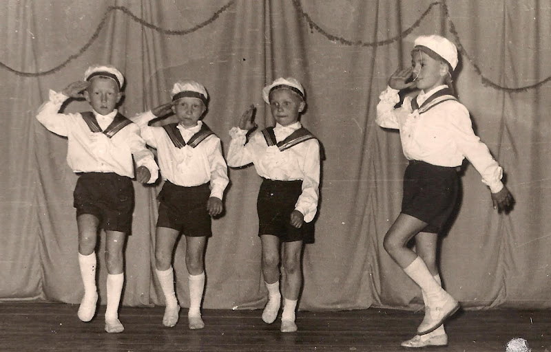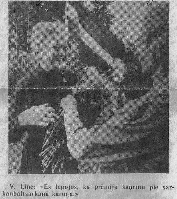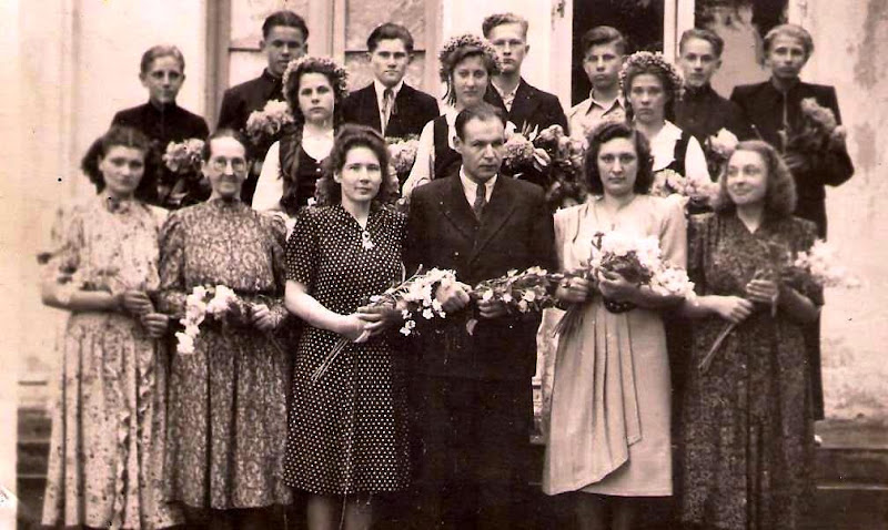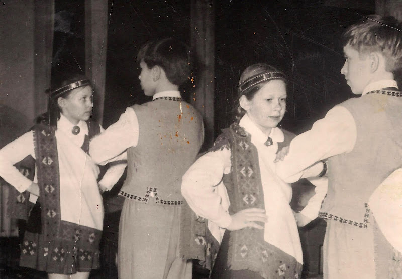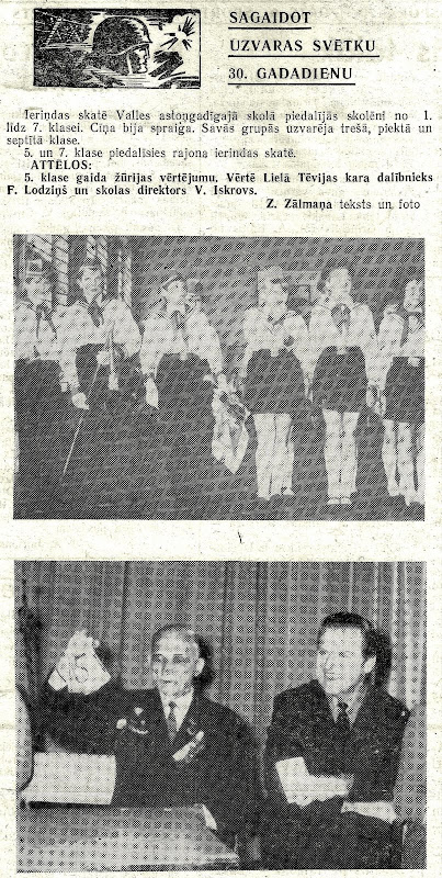 Skolēnu ražas svētkos : Antons Sams ( pirmais no labās ) ar meitu Gitu ( otrā no kreisās ) , Jānis Zvirbulis ( otrais no labās ) ar dēliem Arvīdu ( pirmais no kreisās ) , Jāni ( ceturtais no kreisās ) un meitu Zilgmu ( trešā no kreisās ) , Harijs Zālmanis ( trešais no labās ) ar jaunāko meitu Kristīni .