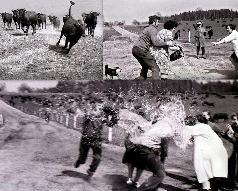 Tas tik bija teātris ! Daudziem mūsdienu jaunajiem cilvēkiem to nesaprast , tādēļ paskaidrošu . Padomju laikā ja brauca fotografēt no avīzes vai filmēt kā šajā reizē , tika mākslīgi noorganizēti visādi pasākumi , gan senās tradīcijas u. c. Mūsu 8. klasei pēkšņi no rīta paziņo , ka brauks filmēšanas grupa no Latvijas TV , un mums jāpalīdz dzīt pirmo reizi govis ganībās . Nekad nekādi skolnieki nepalīdzēja , bet ja vajag , tad mūs kā aktierus filmēšanai aizsūtīja . Izdzina govis , mēs tēlojām kā varenie padomju skolnieki palīdz pie govju dzīšanas aplokos . Filmētāji filmēja un pat izdomāja , ka varētu notikt arī rumulēšanās . Tā ir sena tradīcija - lopu kopējus aplaistīt ar ūdeni , lai govīm daudz piena . Protams kolhozos to tradīciju vairs nepiekopa , bet ja vajag , tad rumulēsies arī . Slaucējas ņem spaiņus un gāž viena otrai virsū aukstu ūdeni . Domāju , ka klusībā viņas lamāja tos filmētājus , kuras viņas pakļāva šādai nodarbei . Jo drēbes slapjas , kur izžāvēt nav , var pat saaukstēties . Vēlāk , kad skatījos to filmu , maz kas no uzfilmētā vispār tika parādīts .